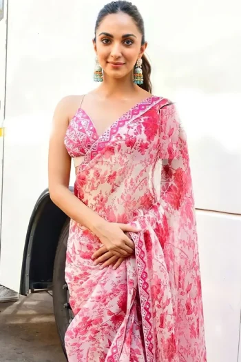 Kiara offers a romantic twist: a red sari printed with floral motifs in soft pastel tones. The gentle florals soften the boldness of red, making it more approachable.