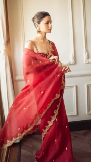 Alia recently embraced a sindoori red silk-organza saree with delicate hand-adda work and zardozi embellishments — balanced, elegant, and deeply wearable.